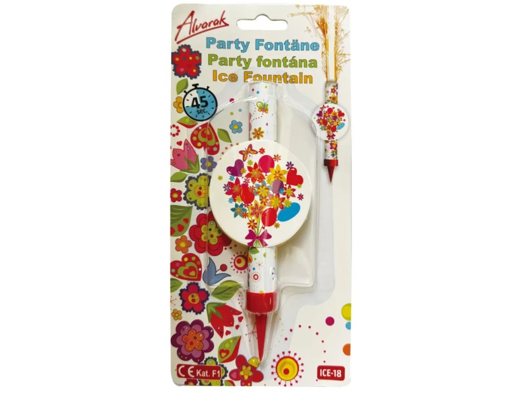 Návod na použitie: červeným plastovým hrotom zapichnúť do torty a opačnú stranu (papierové tesnenie fontány na jej vrchnej časti) zapáľte. Doba horenia je cca 45 sekúnd.