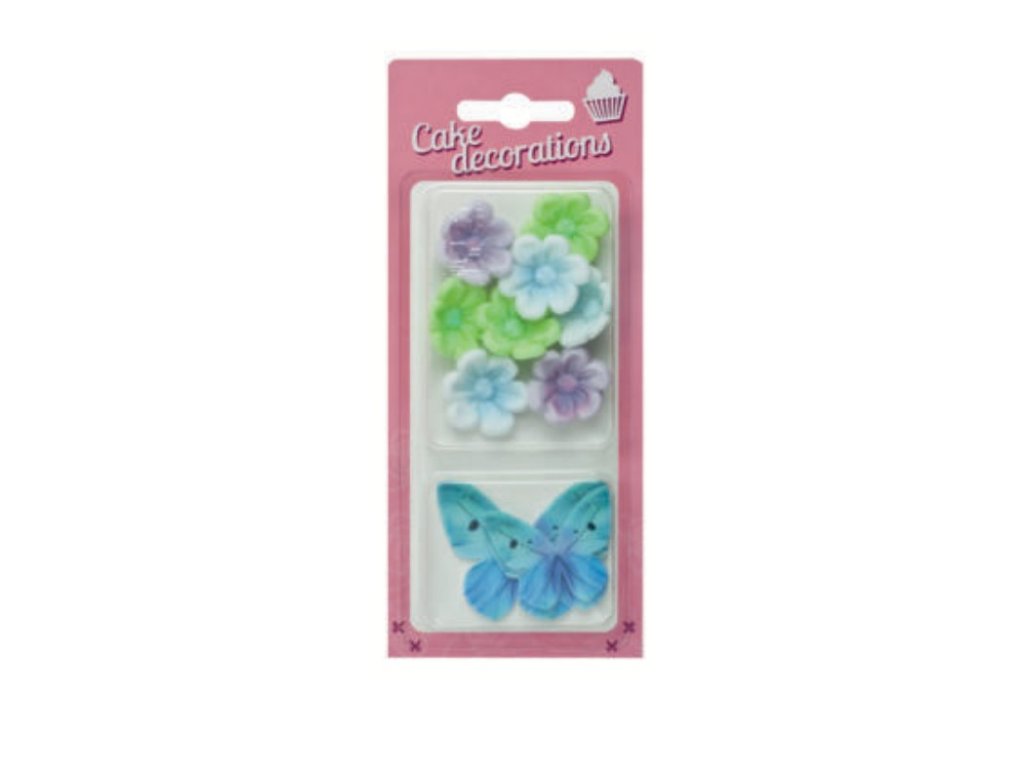Cukrová dekorácia kvietky a motýle- pastel modrá