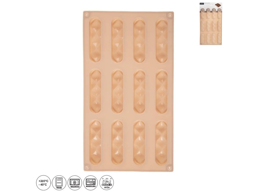 Rozmery: 29,5x16,8x1,5 cm, jednotlivá formička 2,1x8,2 cm. Pozor na poškodenie formy ostrými predmetmi.