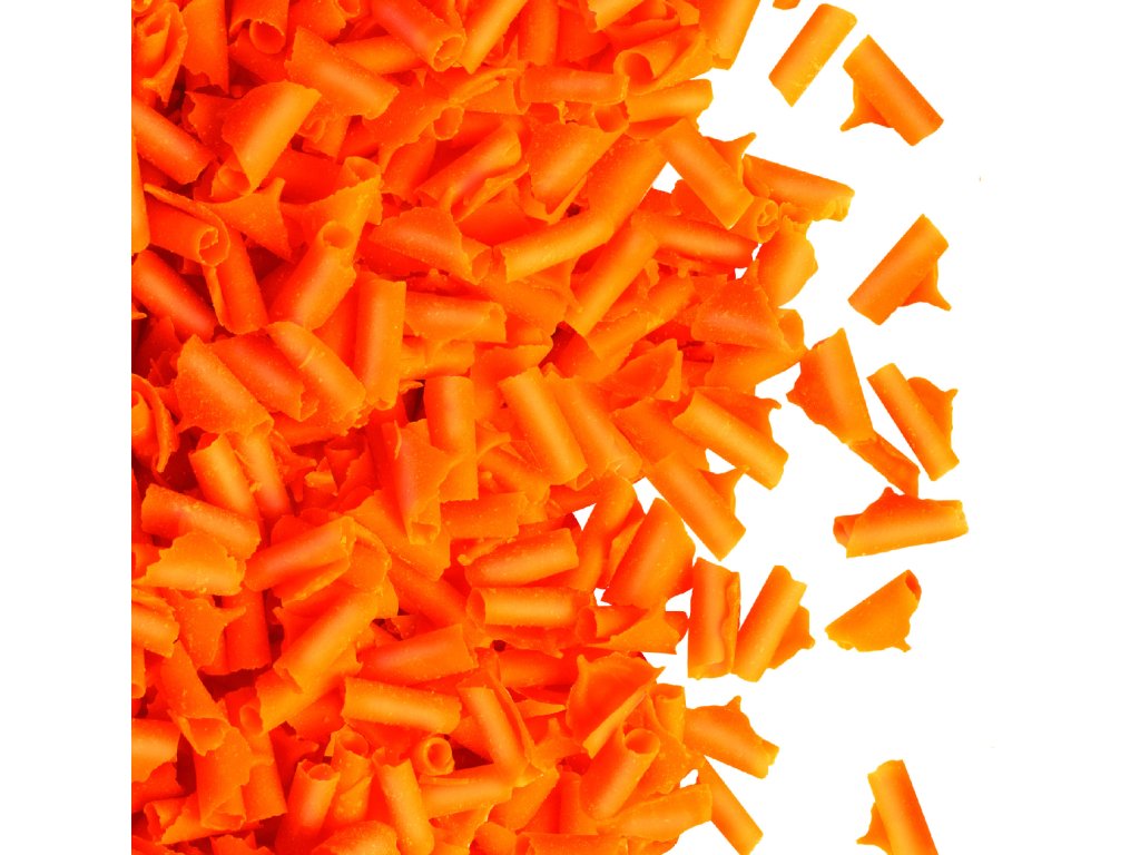Farebná dekorácia v podobe jemných hoblín, 9 x 5 mm, vyrobená z kvalitnej bielej čokolády s prírodnou pomarančovou farbou a príchuťou. Ich všestranné využitie a dizajn a výrazná farba dodajú energiu a pritiahnu k vašim dezertom každého, kto má chuť na sladké.
