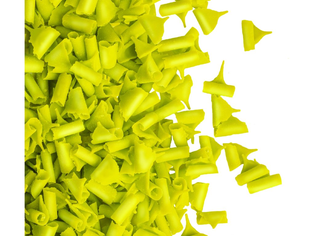 Farebná dekorácia v podobe jemných hoblín, 9 x 5 mm, vyrobená z kvalitnej bielej čokolády s prírodnou limetkovou farbou a príchuťou. Ich všestranné využitie a dizajn a výrazná farba dodajú energiu a pritiahnu k vašim dezertom každého, kto má chuť na sladké.