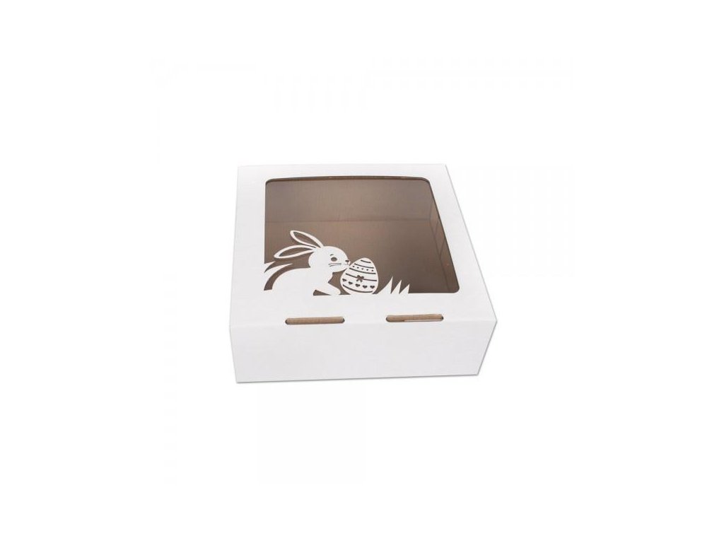 Veľkonočná krabica na koláče a torty s okienkom a výrezom s jedným zajačikom. Vhodná na balenie jednoposchodových tort a koláčikov. Krabica je vyrobená z pevného materiálu (3vl) Ak do krabice ukladáte zákusky, vnútro krabice treba vystlať papierom vhodným na priamy styk s potravinami.