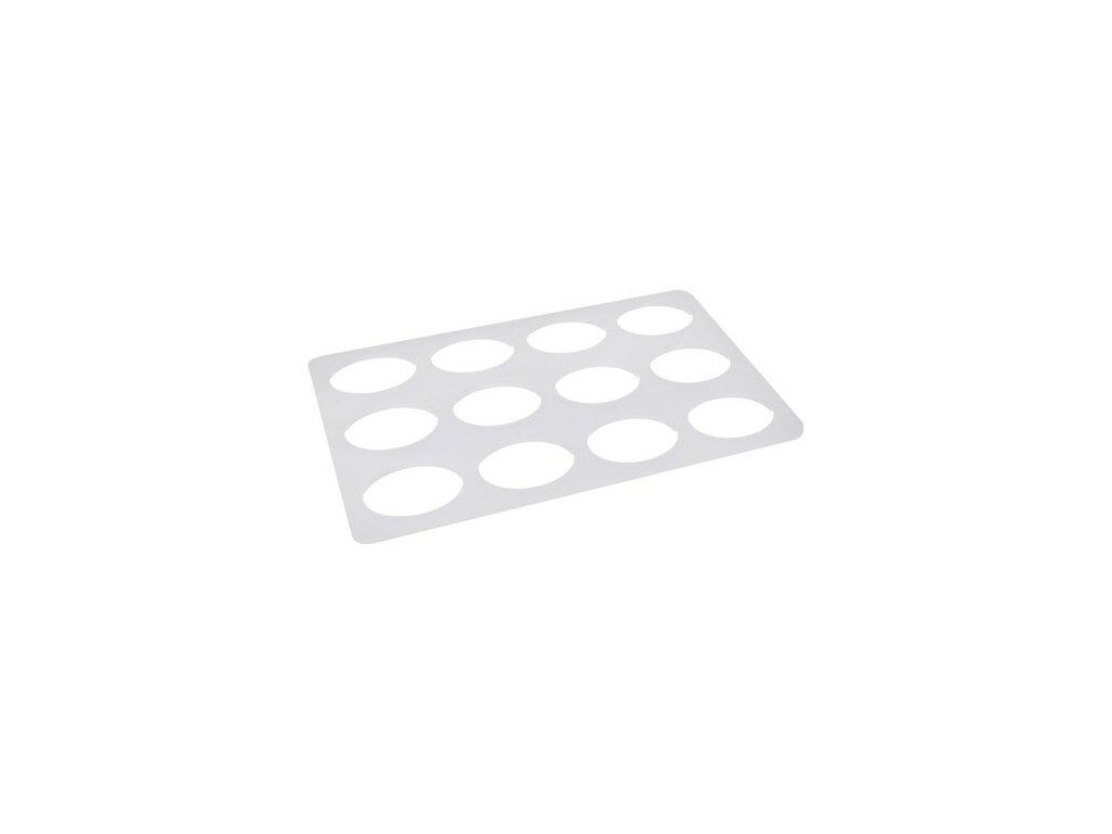 Forma na snehové laskonky 12 ks. Jednoducho položíte šablónu na papier na pečenie na plech, rozotriete stierkou po šablóne snehovú hmotu a formu odklopíte. Rozmery: forma 18 x 30 x 0,5 cm, jedna laskonka 6 x 4 cm.