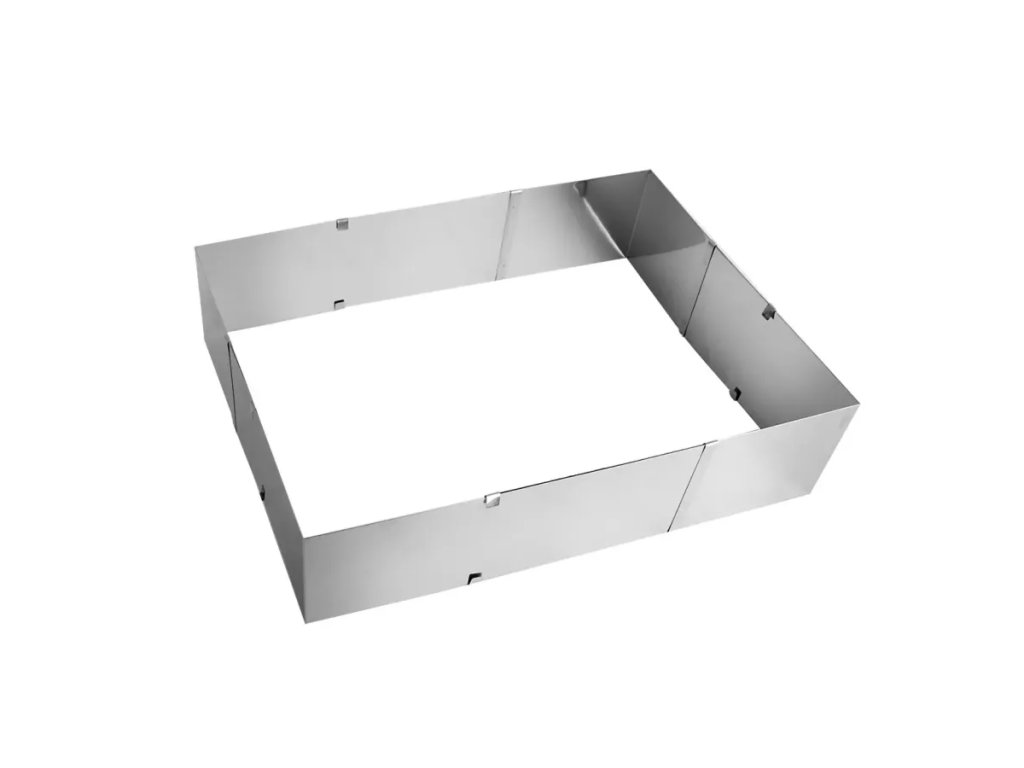 Posuvná nerezová hranatá forma na pečenie tort a múčnikov rôznych veľkostí, od 20x24 cm do 38x46 cm, ideálna pri pečení niekoľkoposchodových tort. Možnosť umývania v umývačke.