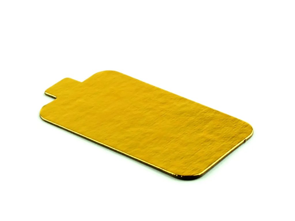 Zlatá podložka s uškom na monoporcie z pevnej lepenky ideálna na malé podlhovasté zákusky, tortičky, či koláče. Je možné ju využiť aj na slané pečivo, či občerstvenie na večierok. Balenie 200 ks.
