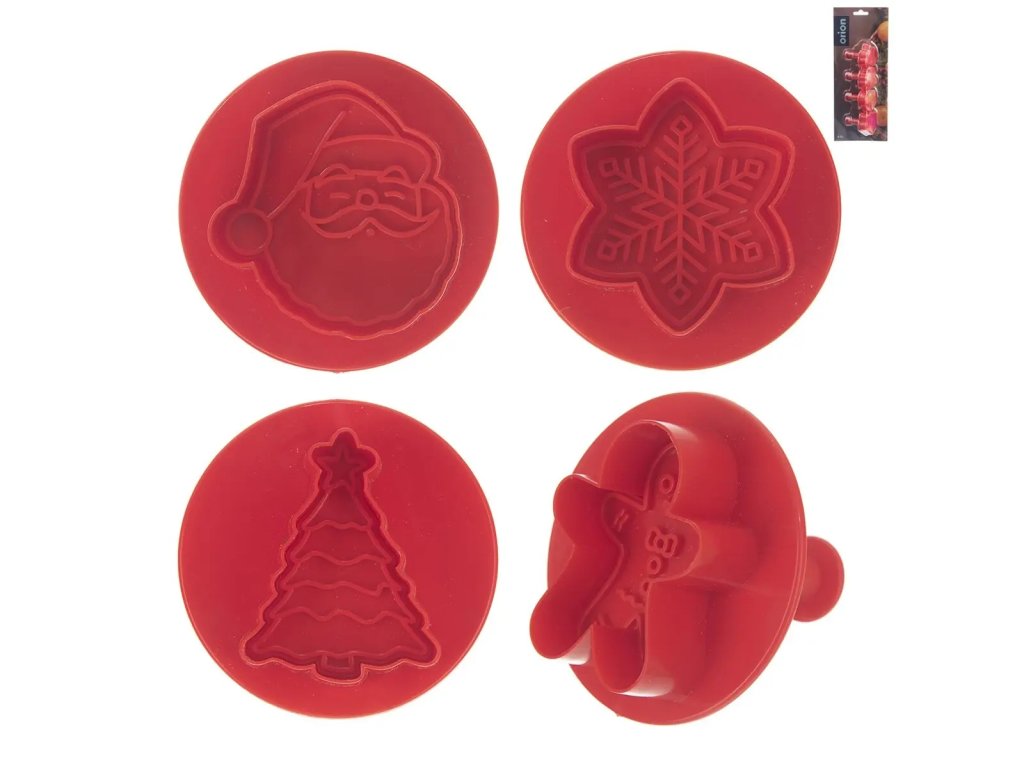 Sada 4 vianočných tvarov – stromček, vločka, Santa, Perníček. Vhodné nielen na sušienky a perníčky, ale aj na marcipánové ozdoby alebo modelovaciu hmotu.