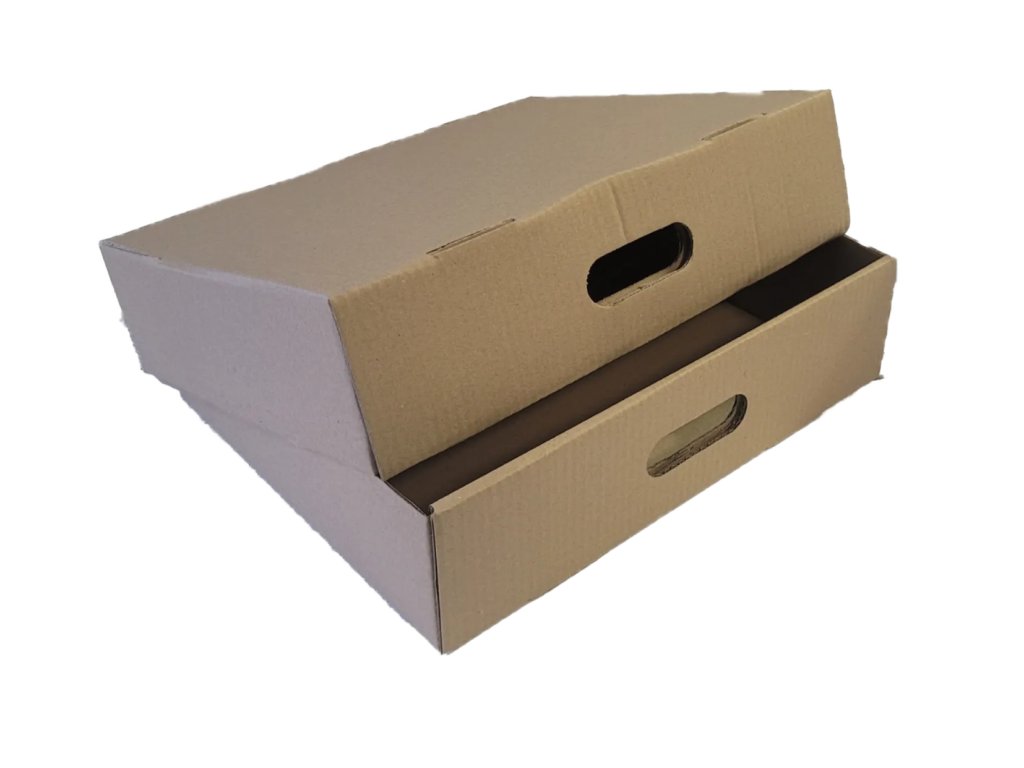 Vyrobená z tvrdej trojvrstvovej lepenky. Výhoda je, že krabice sú pevné, s možnosťou ukladania na seba.